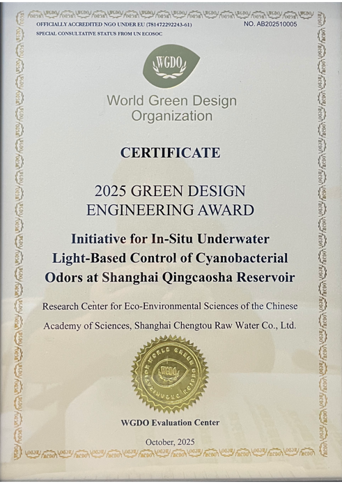 由杨敏团队与上海城投原水公司共同实施的“青草沙水库调光抑藻控嗅工程”,荣获世界绿色设计组织(WGDO)颁发的 2025 年度 “绿色设计工程奖”。